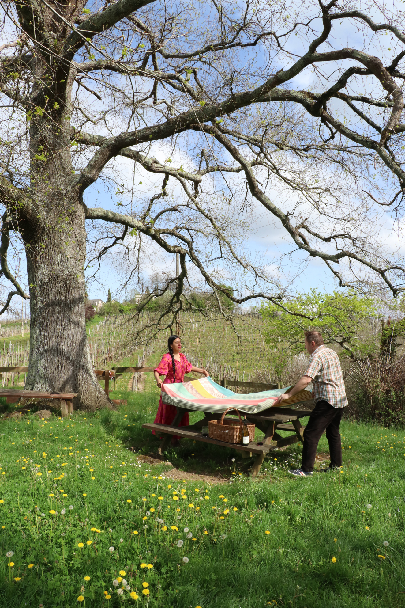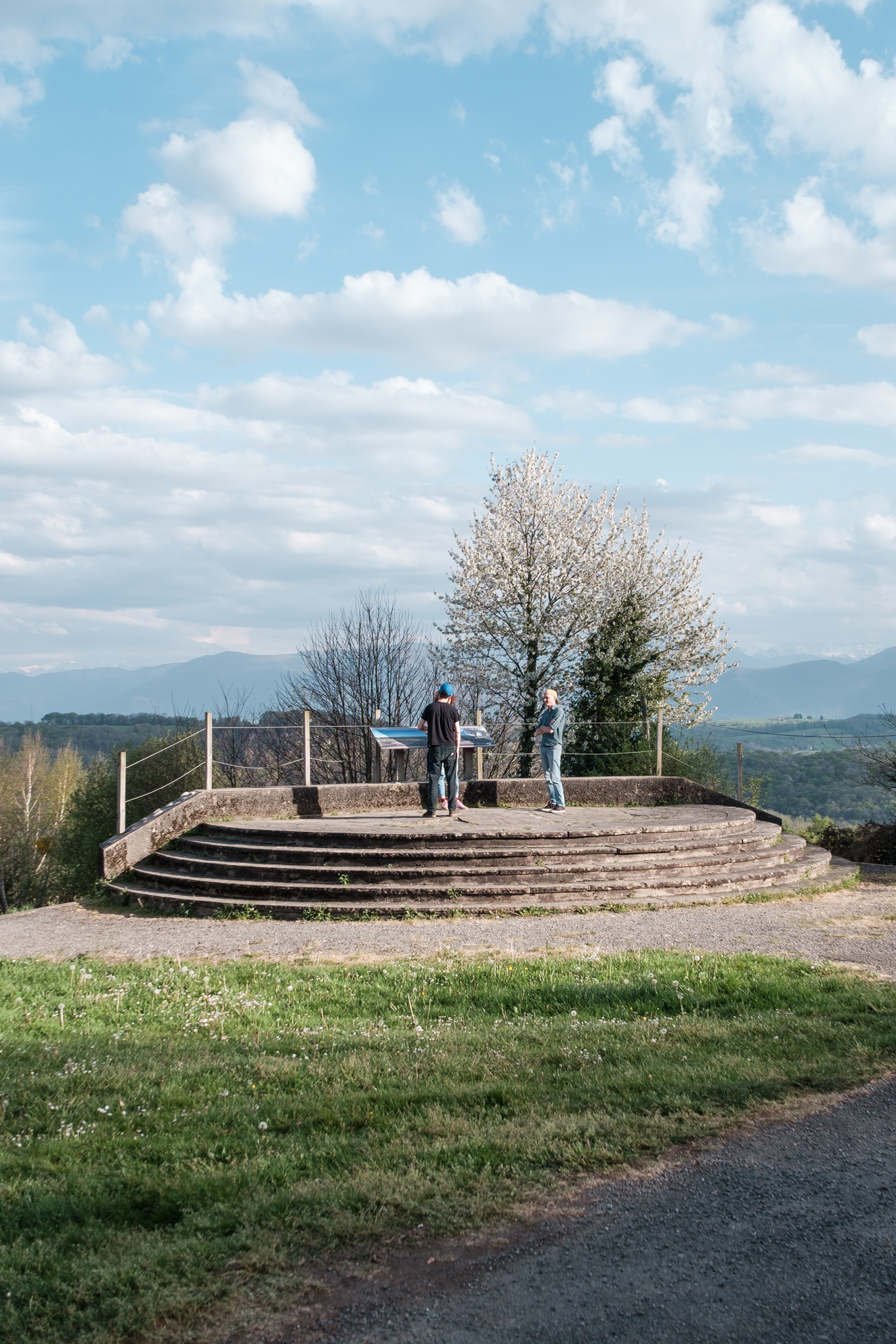 Destination Aubertin, pile au croisement du chemin de la Hélère et de la départementale 346. Une petite table de pique-nique en dur, plateau carrelé façon jambon d’York, plus six sièges font face aux coteaux de Lasseube et aux Pyrénées. Beaux arpents de vignes juste de l’autre côté de la route. Sur ce belvédère la circulation est calme.